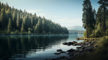 A serene landscape featuring a tranquil lake surrounded by lush greenery and towering mountains in the distance. The image features strong visual details, balanced composition, and