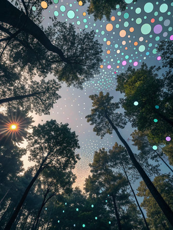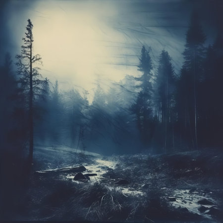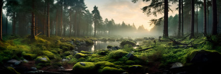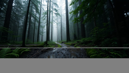 peaceful landscape of mist-covered pine forests, evoking a sense of mystery and tranquility. Generative AI
