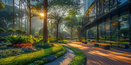 Sunlit modern urban garden with lush greenery and wooden pathway.
