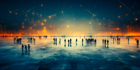 A unique generative illustration of a large group of people, created using artificial intelligence. Conveys the energy and movement of a busy square. Ideal for use in marketing materials