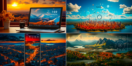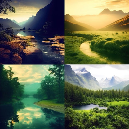 A collection of stunning landscapes features towering mountains, vibrant trees, and rushing waters. The images capture the beauty of nature in various lighting from dawn to dusk.