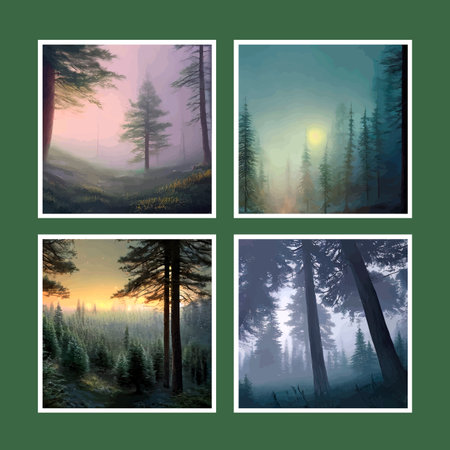 A captivating collection of serene landscapes featuring foggy forests, tranquil meadows, vivid sunsets, and soothing ocean views perfect for nature lovers.