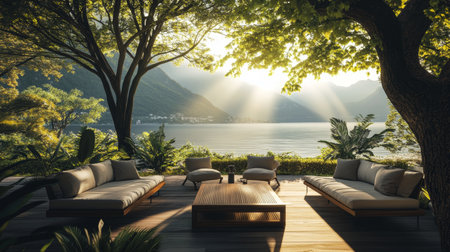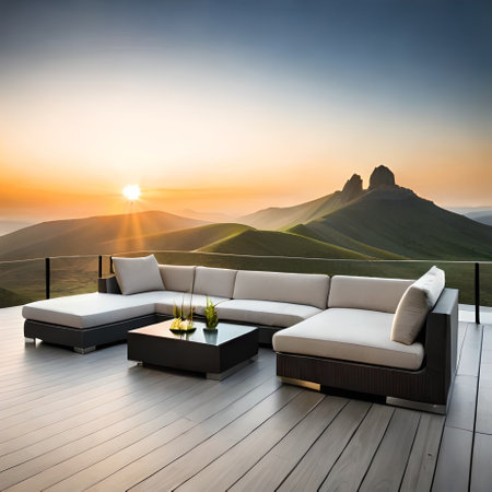 Luxury terrace with sofa and coffee table on terrace overlooking the valley at sunrise