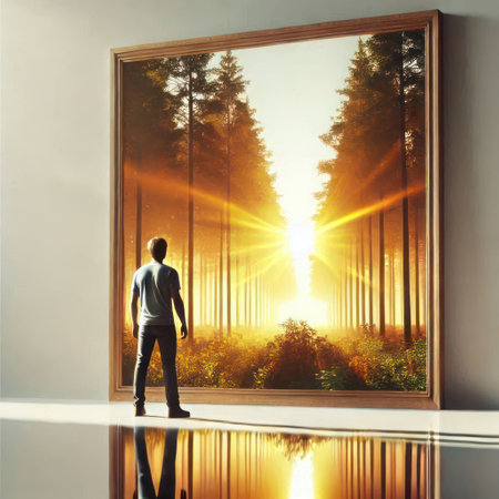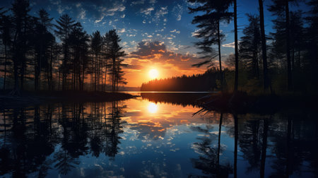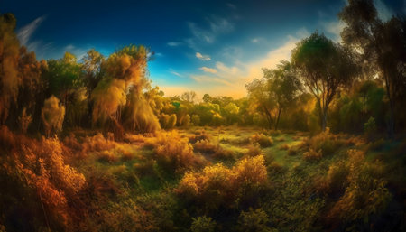 Serene autumn sunset landscape. Golden hour light bathes the forest.