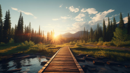 Tranquil sunrise over wooden boardwalk in serene and picturesque summer swamp landscape