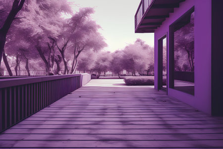 Modern architecture in the park with purple walls and wooden floor. 3d rendering