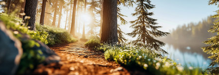 A peaceful forest pathway illuminated by sunlight, surrounded by lush greenery and tall trees