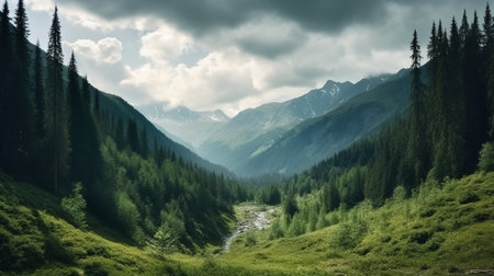 Amazing wild nature view of mountain forest landscape. Generative AI