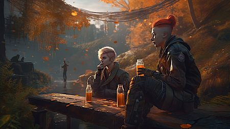 Couple of girls sit together at table and have fun drinking beer in cyberpunk setting outdoors