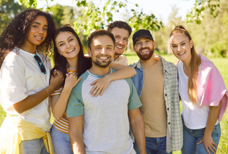 Group of young diverse people enjoy free time in summer, meet up in the park and have fun all together. Bunch of six happy excited multi ethnic friends looking at the camera, smiling and laughing