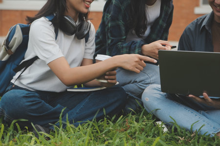 Generative AI : Asian couple student college friends sitting and holding computer laptop in the green park at campus university