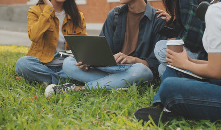 Asian people friends using computer laptop outdoor summer in university