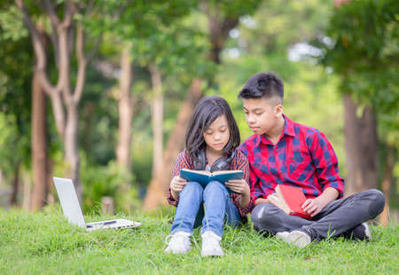 Brother and sister sitting on the grass and reading the book in the park, Kids playing & Outdoor learning concept