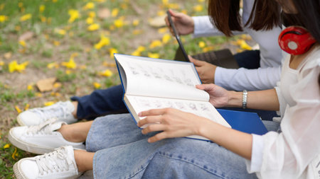 Two students are sitting in park during reading a book and communication. Study, education, university, college, graduate concept.