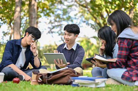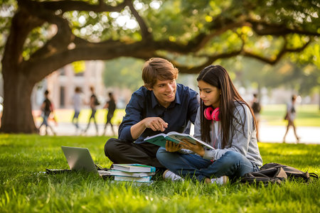 College students studying together at a sunny park, sharing ideas and enjoying nature