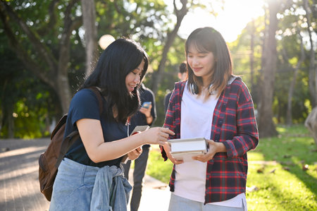 Two pretty and charming young Asian female college students enjoy talking and discussing their school project while walking in the campus's park together.