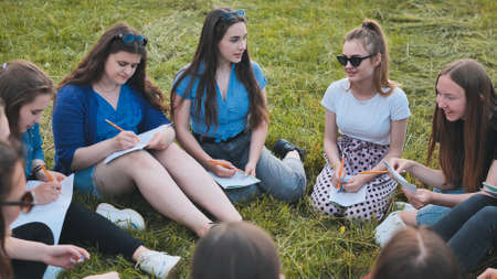 A group of female students are sitting in a circle on a meadow for collective work with notebooks.