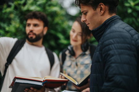 Young friends studying together in a park and exchanging ideas outdoors