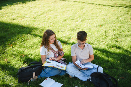 Schoolchildren sitting on grass, studying and discussing books, enjoying education and friendship in an outdoor learning environment