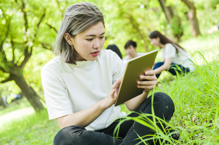 A group of young or teen Asian student in university smiling and reading the book and look at the tablet or laptop computer in summer holiday.