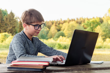 Loveable boy in square glasses smiling while looking at monitor of laptop that lying on table full of schoolbooks. Junior pupil in gray longsleeve enjoy online studying sitting at desk in park.