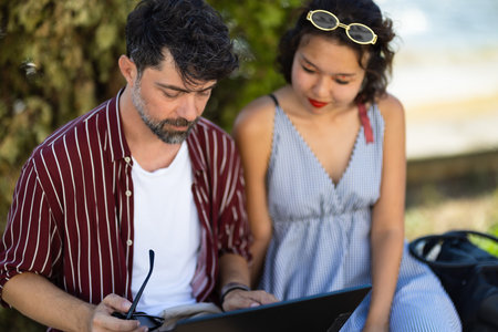 Father and daughter studying together in the park on a sunny day