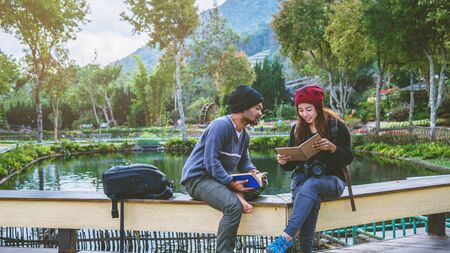 Asian couple travel photograph nature education. nature relax and study read a book. at public park. In Thailand