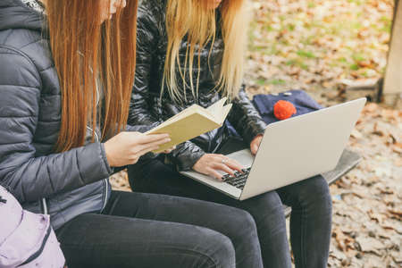 Girls study sitting on a bench in the park in a beautiful autumn afternoon. Teens using laptop and reading a book outdoor. Two students doing homework together outside in the nature. School concept.