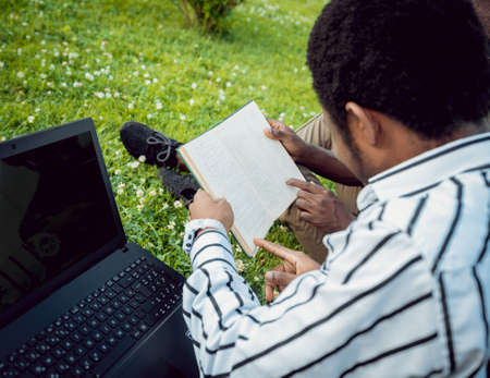 Two students are sitting on the lawn, reading a book together while studying at the university campus. They work together on homework assignments, using laptops and learning in an outdoor environment.