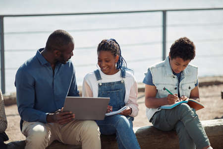 Group of smiling black kids with teacher using laptop together during outdoor lesson in Summer school