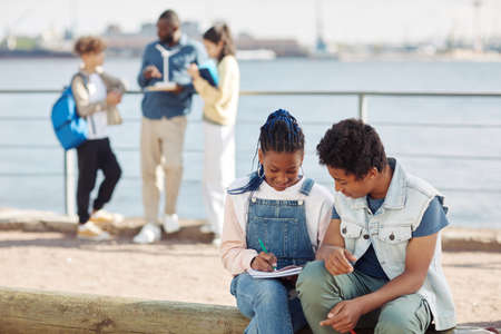 Portrait of two black teenagers writing in notebooks during outdoor class in sunlight with teacher in background, copy space