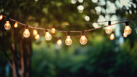Softly glowing string lights create a magical ambiance in an outdoor setting at dusk, enhancing the beauty of nature and inviting tranquility.