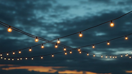 Festive String Lights Against a Twilight Sky Celebration, Atmosphere, and Outdoor Gathering
