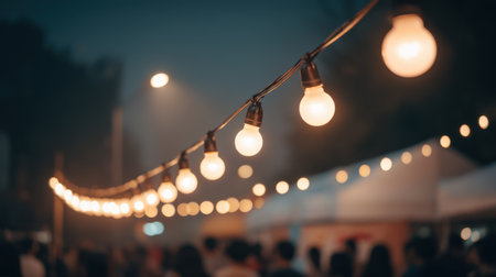 Soft glowing lights hang in a cozy outdoor setting, creating a warm atmosphere for people enjoying an evening festival under the sky.