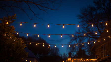String lights illuminating a backyard, creating a cozy ambiance as dusk settles, casting a warm glow for evening relaxation and celebration
