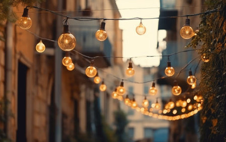 Warm glowing garland lights decorating outdoor seating area in city cafe.