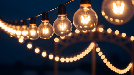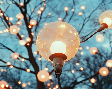 A string of glowing light bulbs hangs against a deep blue evening sky, creating a warm and festive atmosphere. The shallow depth of field creates a beautiful bokeh effect in the background.