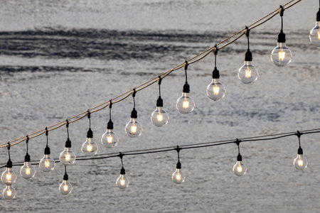 Festive retro garland against the evening sky. Wedding, celebration, event concept.