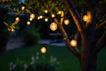 Decorative outdoor string lights hanging on the tree in the back yard at night time close, midges buzzing around on a summer evening