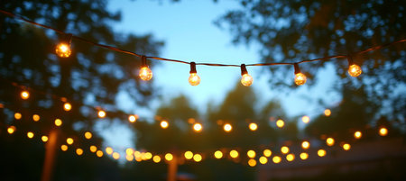 Delightful outdoor string lights create a charming atmosphere against a twilight sky, perfect for evening gatherings or romantic celebrations in open spaces.