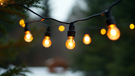 Warm Light Bulbs Glowing on a String, Creating a Cozy Atmosphere in Winter with Falling Snow
