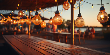 light bulbs on string wire decoration at the party event festival on the beach at sunset. Outdoor holiday background. Copy space