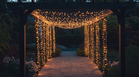A captivating garden pathway adorned with glowing string lights creates a warm and enchanting atmosphere under the evening sky, perfect for romantic moments or celebrations.