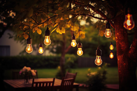 Step into a dreamy garden oasis in the heart of the night, where decorative outdoor string lights gracefully hang from the trees, casting a warm and inviting glow. This captivating scene evokes a sense of enchantment and romance, perfect for outdoor gatherings, celebrations, or simply unwinding under the stars.