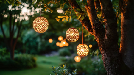 Cozy garden scene featuring beautifully lit lanterns hanging from trees, creating a warm and inviting ambiance in a serene outdoor setting.