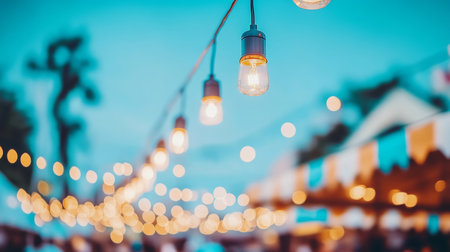 Soft glowing lights hang in a cozy outdoor setting, creating a warm atmosphere for people enjoying an evening festival under the sky.