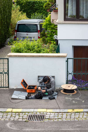 Paris, France - May 20, 2019: Vertical image above of engineer worker arranging setting optic fiber in the manhole during local deployment of high speed internet with house and car in background