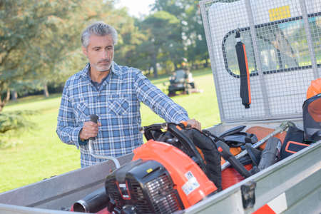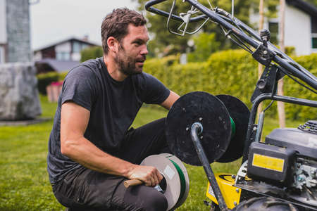 mowing trimmer - worker man repair the string trimmer