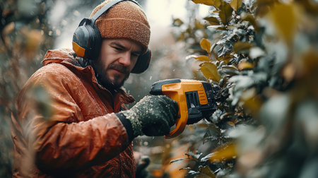 Selective focus of gardener in overalls and cap pruning bushes with electric trimmer