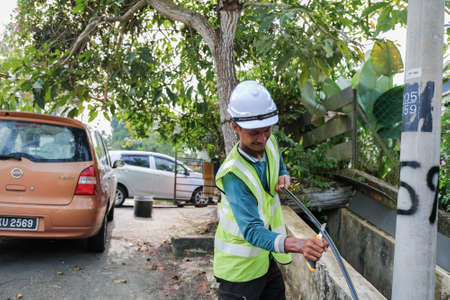 Muadzam Shah, Malaysia- September 1st, 2021 : Worker from telecomunication internet provider company working on implementation of fiber optic cables in Muadzam Shah .